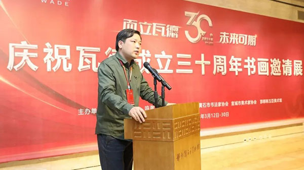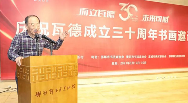 瓦德集團(tuán)董事長謝富強(qiáng)向與會(huì)的各路藝術(shù)家及賓朋表達(dá)了熱情歡迎。向河北邯鄲、湖北黃石、安徽宣城三地文聯(lián)、書協(xié)、美協(xié)和書畫家們的大力支持表達(dá)了衷心感謝。尤其對(duì)中國知名書畫家,邯鄲市書協(xié)主席,文化名人,著名企業(yè)家韓玉臣先生對(duì)瓦德集團(tuán)慶典活動(dòng)的鼎力支持表達(dá)了深深的敬意和由衷地感謝。在三千年歷史的趙國都城邯鄲,能有瓦德集團(tuán)如此注重文化藝術(shù)的實(shí)屬難得,能將深厚的中國文化的脈絡(luò)注入到自己的企業(yè)產(chǎn)品中非常難得。